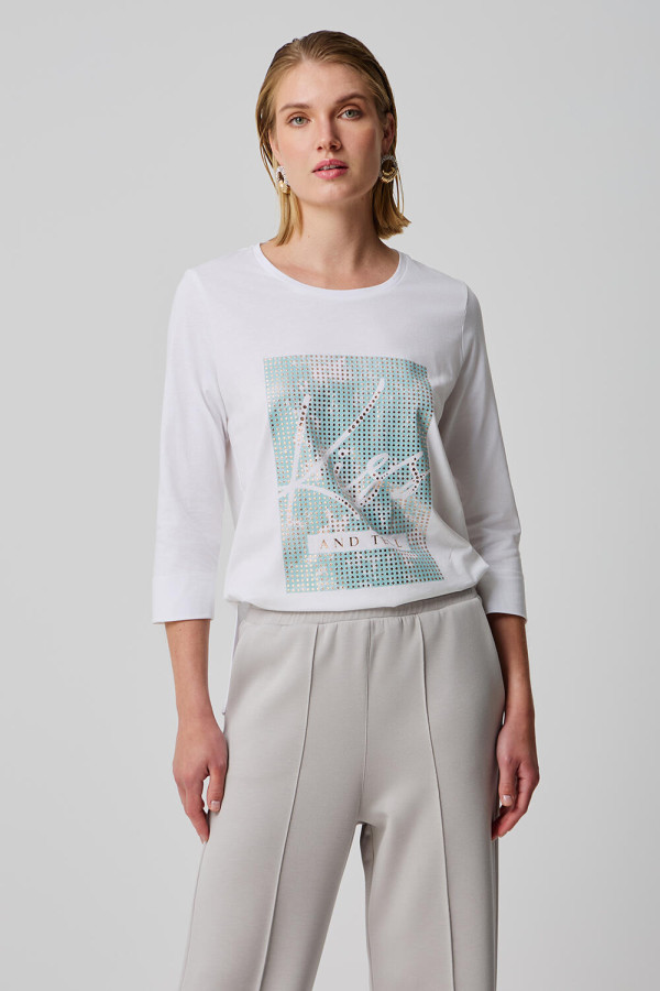 Γυναικείο tshirt Bill Cost. Είναι με στρογγυλή λαιμόκοψη και βεραμάν τύπωμα με στρας στο στήθος. Είναι με μανίκια 3/4 και είναι κατασκευασμένη απο εξαιρετικής ποιότητας οικολογικό βαμβάκι. Άνετο και κομψό θα γίνει η αγαπημένη σας casual μπλούζα.