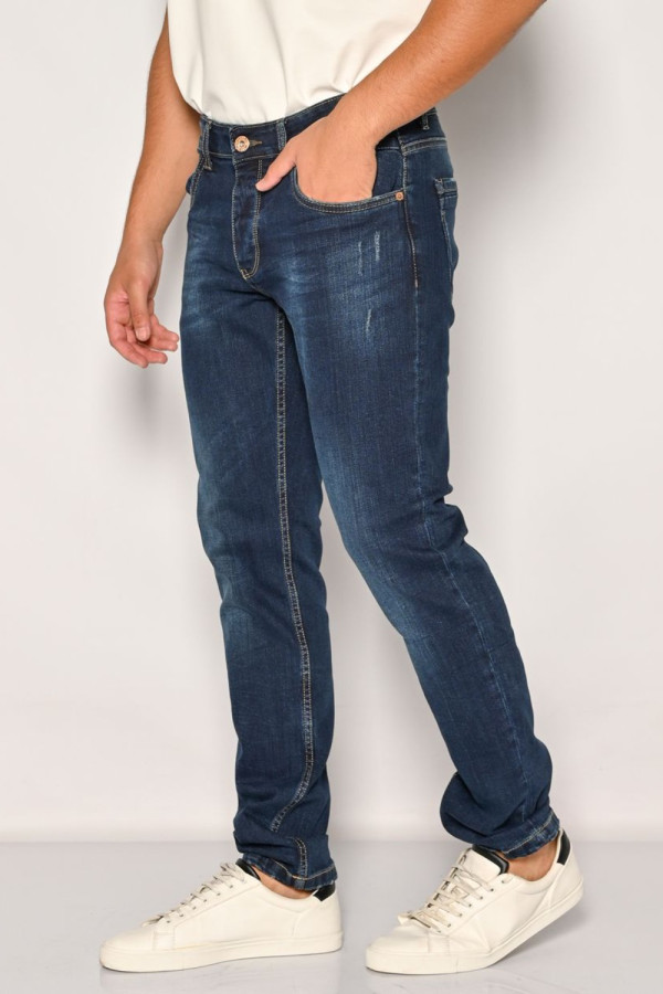Ανδρικό Jean παντελόνι μπλε Camaro με διακριτικά ξεβάμματα και κανονική εφαρμογή που θα σε βολέψει στην καθημερινότητα σου. Μπροστά κλείνει με κουμπιά. Σε ποιοτικό βαμβακερό ύφασμα με ελαστικότητα που προσφέρει άνεση και τέλεια εφαρμογή. Θα γίνει το αγαπημένο σας καθημερινό παντελόνι.
